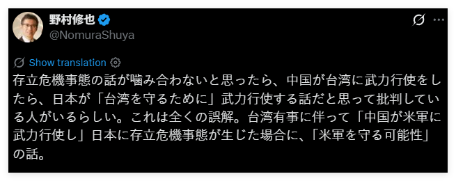 日本中央大学的法学教授野村修也,以及日本朝日大学的法学副教授加藤博章,最近就不约而同地在境外社交网络和媒体上抛出了一种言论。其内容是:高市早苗并不是要“防卫台湾”,而是假设台湾问题牵扯美国,日本得按照协议帮助美国,所以高市早苗的立场与先前的日本政府相比“并没有变化”。
